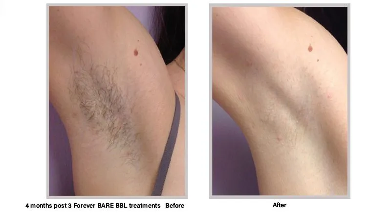 Immediately following your treatment, you may experience some redness that should go away within a few hours. A few days to a week after treatment you may experience what seems to be regrowth of hair. Most of these hairs are actually being shed as a result of your Forever Bare BBL treatment and are not growing back. Minimal aftercare is needed. Your clinician will provide you with more information on what to expect as well as give you an aftercare plan to follow that will involve avoiding direct sun exposure and using sunscreen.