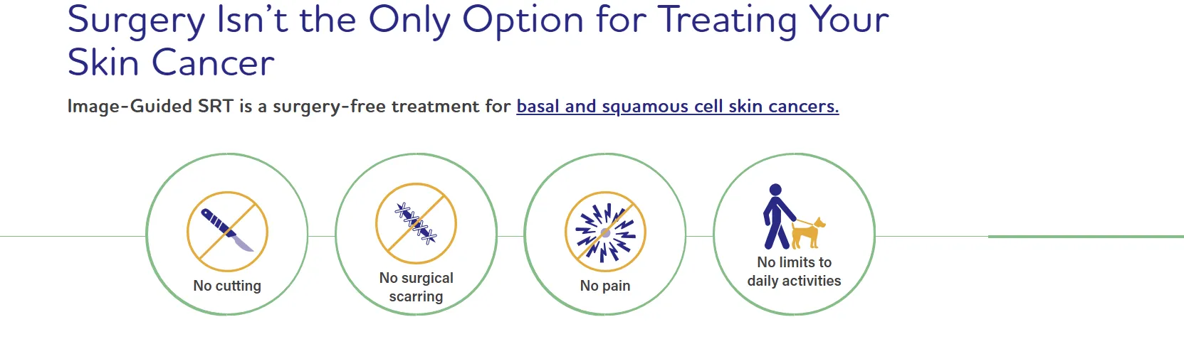 There are several different radiation-based technologies for the treatment of skin cancer. Cure rates and cosmetic outcomes vary based on the technology and protocol. We use only Image-Guided SRT because both the cure rate and cosmetic results are superior to all other radiation-based options. If you are considering radiation therapy, you’ll want to make sure you’re getting Image-Guided SRT with an adaptive radiotherapy protocol. It’s the gentler way to treat skin cancer.